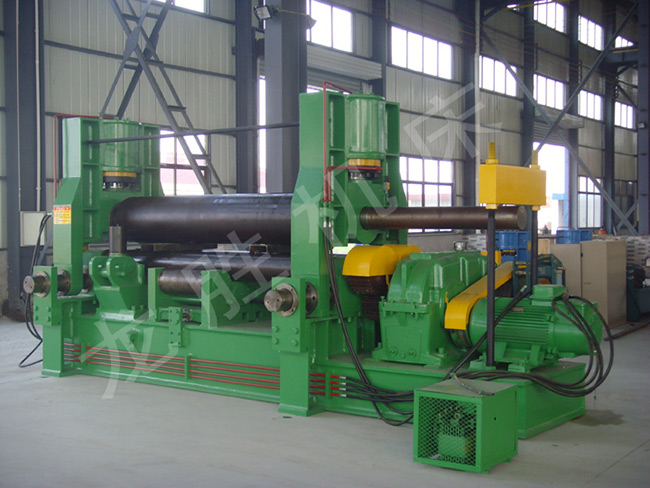 该机属于液压型三辊卷板机,用于常温状态下将各种容器用碳钢、低合金钢一次上料后不需调头即完成板材端部预弯、卷圆和矫圆等工序。 上辊可以垂直移动、水平移动。 预弯通过上辊水平移动,使上辊相对于下辊呈非对称位置来实现。