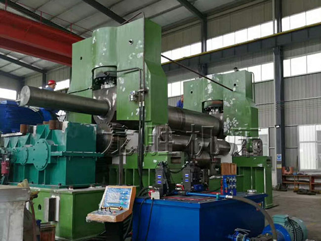 该机属于液压型三辊卷板机,用于常温状态下将各种容器用碳钢、低合金钢一次上料后不需调头即完成板材端部预弯、卷圆和矫圆等工序。 上辊可以垂直移动、水平移动。 预弯通过上辊水平移动,使上辊相对于下辊呈非对称位置来实现。